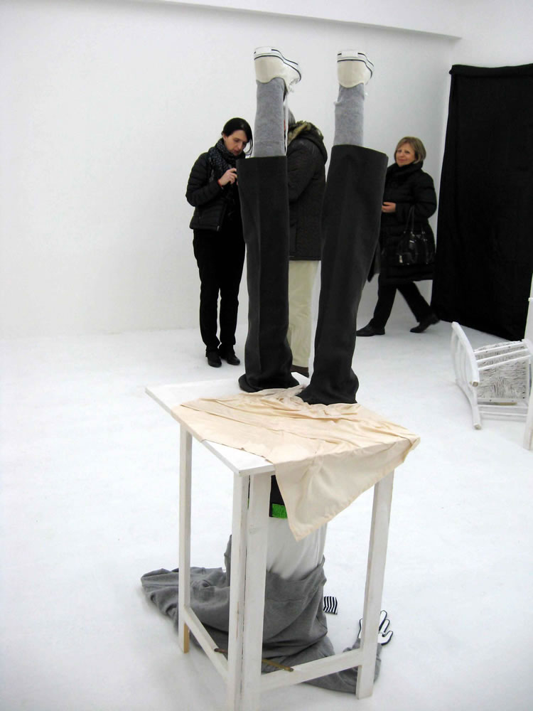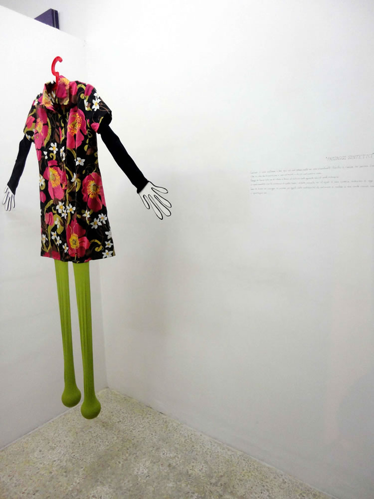 "Questa epoca storica è connotata da una forte alterazione della dimensione spazio-tempo. Presente e futuro sono adesso, siamo in più posti nello stesso momento, quello che succede in questo istante è già noto a migliaia di chilometri prima ancora che l'evento abbia avuto la possibilità di concludersi e di sprigionare la sua energia. Tutte le energie inespresse formano così una nube cosmica che ci avvolge e siamo come elettroni che fluttuano sospesi entrando a far parte di orbite che non conosciamo e dalle quali non riusciamo a sfuggire, il principio di indeterminazione che ci regola rende vano il tentativo di individuazione della nostra posizione come fossimo particelle elementari. Ho immaginato di respingere il rapido fluire della realtà attraverso i mezzi che collegano reale e virtuale, quello che siamo e quello che vorremmo essere, impacchettando gli oggetti della quotidianità che divenuti estensioni del corpo vengono privati delle loro funzioni vitali. La reazione alla realtà svuotata delle certezze quotidiane: ci sconvolge, ci urta, ci infastidisce e destabilizza Una forza impetuosa e violenta ci spinge a fuggire lontano. L'istante infinitesimo successivo all’urto carico dell’energia del cambiamento genera una forza propulsiva. Come un proiettile il corpo attraversa lo spazio quotidiano, gli oggetti che incontra sulla sua traiettoria, partendo per un viaggio al centro della terra alla ricerca di una nuova dimensione spazio-temporale, verso la costruzione di un nuovo modello mentale che aprendosi a nuove forme, ribalta le regole e spinge a rimettersi in gioco".